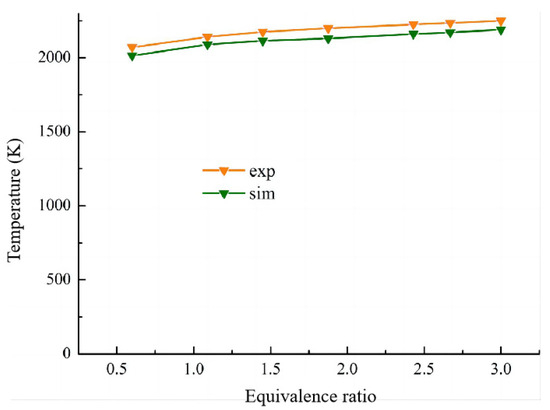 The experimental results of Chen [53] are compared with the simulation results of this work. The burner used in the experiment is a horizontal rectangular pipe made of quartz glass with dimensions of 500 mm × 110 mm × 80 mm, which is located on the metal frame. The mathematical models and reaction mechanisms used in the simulations are those mentioned above.