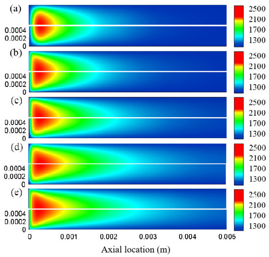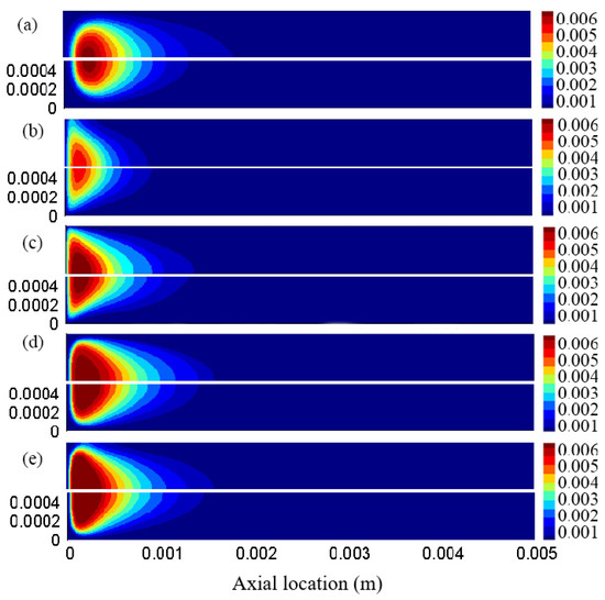 Consistent with the results of Raimondeau [29], two different zones can be distinguished based on the temperature and the free-radical distribution after combustion, where the combustion zone is approximately the axial distance from 0–0.7 mm, and the rest is the burnout zone. Comparing the upper and lower figures of Figure 5a–e reveals that the active and inert wall surfaces have little effect on the overall temperature distribution in the microchannel at each pressure. The temperature of the microchannel combustion zone on the inert surface is slightly lower than that on the active surface at a pressure of 2 atm, whereas at 2.5 atm and 3 atm, the situation is just the opposite, with the temperature under the inert surface being slightly higher than that of the active surface.