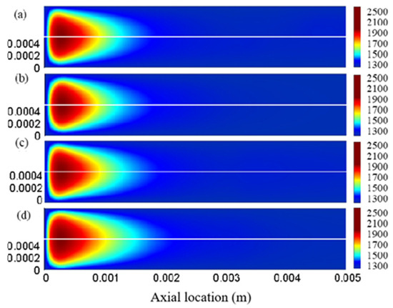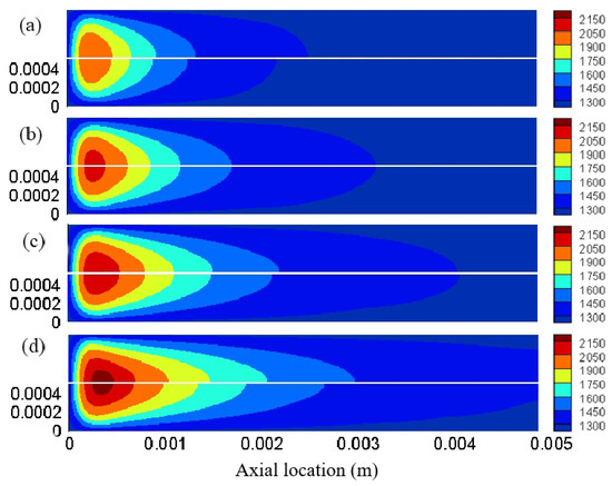 The temperature contours of the microflame with inert (upper) or active surfaces (lower) with distinct inlet velocity, with the parameters P = 1 atm, ϕ = 1.0, u0 = (a) 0.5 m/s, (b) 1.0 m/s, (c) 1.5 m/s, (d) 2.0 m/s.