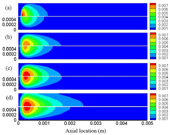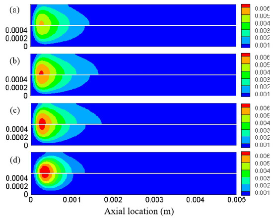 The mass fraction contours of OH radicals of the flame with inert (upper) or active surfaces (lower) with distinct inlet velocity, with the parameters P = 1 atm, ϕ = 1.0, u0 = (a) 0.5 m/s, (b) 1.0 m/s, (c) 1.5 m/s, (d) 2.0 m/s.