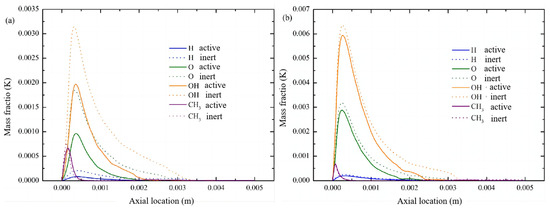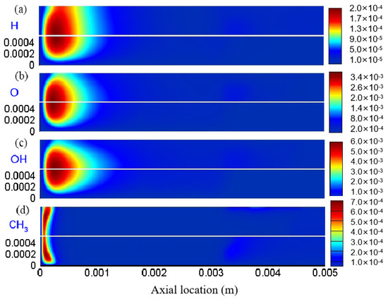 The difference-temperature distribution is mainly affected by the surface reactions on the distribution of different radicals, so further discussion is necessary [59]. At an equivalence ratio of 0.8, a pressure of 1 atm, and a flow velocity of 1 m/s, the mass fraction contours of the simulation results of H, O, OH, and CH3 radicals, which are important for flame propagation and flame stability, are shown in Figure 12. For inert surfaces, the mass fractions of all radicals, especially the H, show a slight lateral gradient. Each radical exhibits a slightly higher mass fraction on the inert surface than on the active surface. This is because during the combustion reaction, free radicals will participate in the reaction at the active near-wall surface and be consumed, resulting in a reduction in mass fraction. It is also found that the distribution of OH radicals is not consistent with other radicals. The high concentration region of CH3 radicals is more advanced than other radicals; that is, the mass fraction peak comes earlier, which needs further discussion.