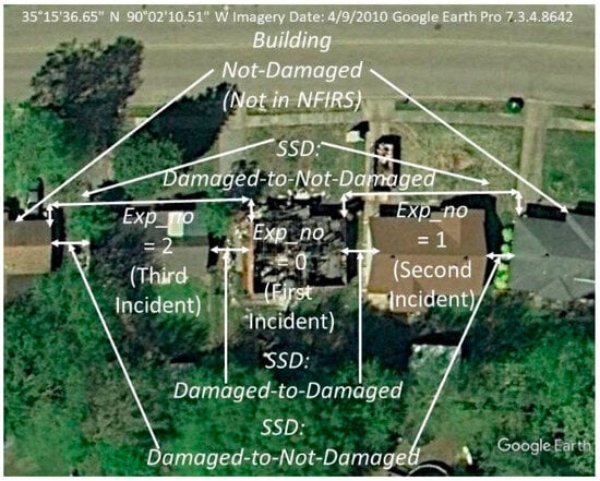 The next filter ensured that the remaining exposures were consecutive (e.g., single-family structure to single-family structure). Therefore, incidents where the exp_no was not consecutive were removed (e.g., a three-exposure fire with two structures having exp_no of zero and two, respectively, and the second exposure with an exp_no of one was a vehicle and not geocoded). The remaining exposure fires also required a footprint in the MS™ dataset [