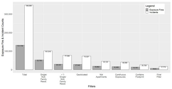 Appendix A. First, the dataset of exposure fires was filtered for single or multifamily structures (i.e., inc_type equal to 111 and prop_use equal to 419 or 429). Geocoding of NFIRS exposures is often by address with the point location occurring on the primary structure (e.g., home). Consequently, other incident types (e.g., vehicles) could not be precisely located beyond the primary structure location.