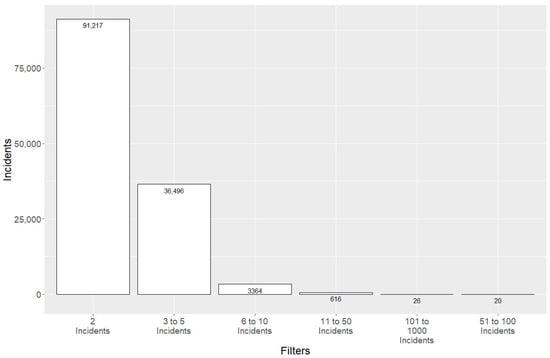 Selecting only those incidents with an inc_type equal to 111 (building fire, not confined) and prop_use equal to 419 or 429 (one- or two-family dwelling or multifamily dwelling, respectively) resulted in some exposure fires with only one incident (e.g., an exposure fire where a vehicle ignited a home). These exposure fires with only one incident (i.e., no residential structure-to-structure fire spread occurred) were removed. After applying this filter, incidents containing information to geocode the feature at the structure level were identified. A subsequent filter excluded exposure fires on multifamily residences in one structure (e.g., apartment fires in the same structure).
