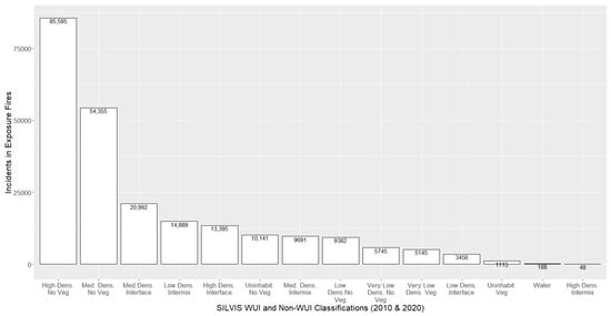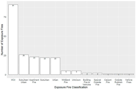 Additionally, exposure fires with greater than 20 incidents were examined. The type of fire (e.g., WUI, wildlands, suburban, urban, apartment only) was described based on examining the location in Google Earth™. Wildland fires contained only vegetative fire incidents. WUI fires contained at least one vegetative fire incident with a human-made fire incident type or, in some cases, contained no vegetative fire incidents but were known to be started by wildland fires (e.g., the 2016 Montana Roaring Lion Fire). Urban fires occurred in areas with limited to no vegetation. Suburban fires occurred in residential areas, and suburban/urban fires occurred in areas with a mix of suburban and urban areas as interpreted by overhead images in Google Earth Pro™.