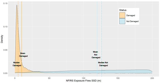 Despite the significant data reductions, this study examined SSD between single/multifamily structures across thousands of exposure fires, identifying a significant difference, though not necessarily representative of the national exposure fire problem, in the SSD distributions between the damaged-to-damaged and not-damaged-to-damaged structures within 200 m of the damaged structures. The probability of finding a damaged structure near another damaged structure peaks when the SSD is about 3 m. However, this peak should not be used to indicate a safe SSD in exposure fires, as many factors can affect an appropriate SSD to curtail fire spread. For example, the significant difference in SSD distributions is partly due to the fire containment by first responders.