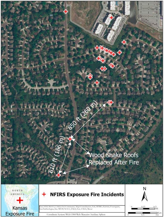 30] and pre-fire Google Earth™ aerial and StreetView imagery, we could confirm structure-to-structure ember spread over a significant distance (at least 260 m), also highlighting the risk of wood shake roofs in ember fire spread. Integrating these exposure fires with ancillary data, such as images and videos, can increase the understanding of factors and mechanisms affecting fire spread in exposure fires.