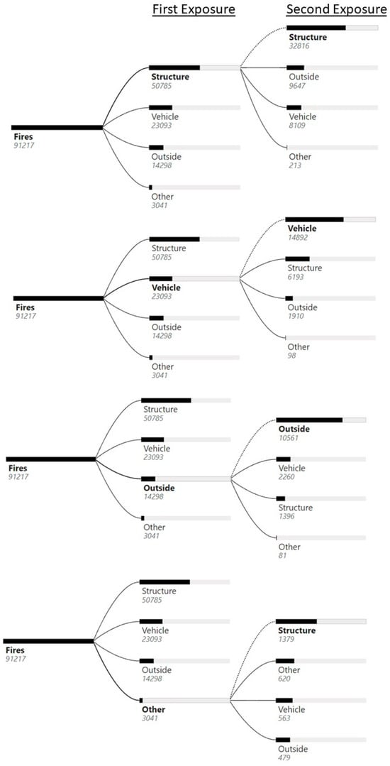 Interestingly, when the first incident in these two exposure fires is a structure, the second incident tends to be a structure, and this same pattern holds for vehicles, outside fires, and other fires. This similarity could be because features of similar types are found next to each other. This finding supports the role of smaller SSDs in fire spread, as these features must be in proximity to ignite each other. Nonetheless, NFIRS-reported exposure fires identify many possible ignition pathways, highlighting that fires do not always spread to the same feature. Also, future studies might utilize the alarm attribute, which theoretically identifies the time of the ignition to identify ignition pathways in fires with more than two incidents. However, recreating these fire timelines to capture ignition pathways precisely is challenging.