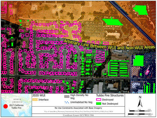 However, at a fine scale, these non-WUI areas can look similar to areas mapped as WUI, with arbitrary lines that fire easily crosses, sometimes delineating the two environments (e.g.,