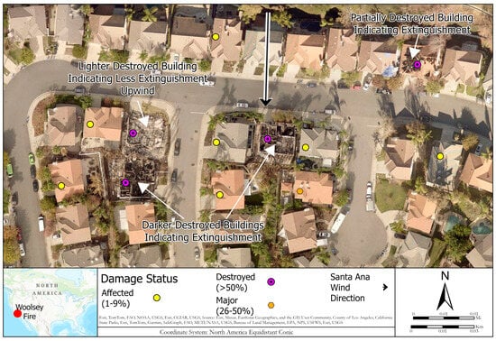 Figure 1 (i.e., a darkened appearance of some destroyed structures due to the cessation of the combustion process through extinguishment), and similar to those documented at other exposure fires [