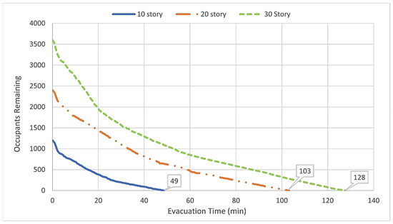 The results of evacuation plotted in Figure 4 show that there is a significant increase in the evacuation time with an increase in the number of stories of the building from 10 to 30 stories. The total evacuation time for the hospital building with 30 stories is 128 min which is almost three times the total evacuation time for the hospital building with 10 stories (49 min), while the evacuation time is 103 min for a 20-story hospital building. Thus, necessary provisions, such as a wider egress path, as necessitated by IBC 2018 [4] and NFPA 101 [5] need to be provided to ascertain the safe and efficient evacuation of a hospital building with a higher (more than 10) number of stories.