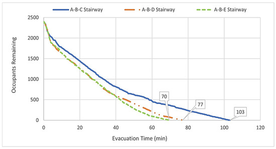 The results show that the total evacuation time is the least for the Case 3 stairway arrangement A, B, and E (with two stairways in the core and one outside the core), with an evacuation time of 70 min. The evacuation time increases by 49% for the Case 1 arrangement A, B, and C, with an evacuation time of 103 min (see Figure 5). The plot illustrated in Figure 5 shows the trend of evacuation, with the total occupants remaining to exit the building plotted on the y-axis vs. the total time elapsed during the evacuation. The second case of stairway arrangements A, B, and D have a total evacuation time of 77 min, which is closer to the arrangement A, B, and E (Case 3). It is also seen that the total time to evacuate for the arrangement A, B, and C is more than the time required to evacuate with two stairways. The main reason for the drastic increase in the evacuation time is the increased congestion and bottlenecks present for the arrangement A, B, and C due to the closer proximity of staircase A and staircase C, which are separated only by a wall (see Figure 3). In the absence of situational awareness (information about progression of fire and congestion on several stairways), people tend to evacuate from the closest exit possible. This results in more people being inclined towards exiting from staircase A and C causing bottlenecks and congestion at the corridor as well as the entrance for these stairs due to limited flow capacity. The same stairway arrangement was used by Kodur et al. [6] for evaluating the evacuation time for a high-rise office building. In their study, also, it was noted that the total evacuation time for the A–B–D arrangement within the core was slightly less (67 min) than the A–B–E arrangement (74 min). Since Kodur et al. [6] used self-evacuation for the simulation, the absence of space-consuming wheelchairs and beds made it easier for occupants to go to the stairs which were centrally located in the core and easily accessible. However, this was not the case for assisted evacuation in a hospital building wherein the location of stairways outside the core helps in modulating the space-consuming traffic of assisted patients. Thus, providing a staircase outside the core of the building seems to be a better strategy to reduce the stagnant traffic of beds and wheelchairs present in a hospital environment.
