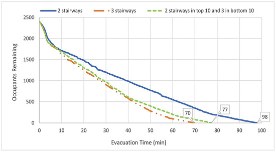 The simulation results (See Figure 6) show that Case 2 with three stairways has the lowest evacuation time of 70 min, while in Case 1 with two stairways the evacuation time increases to 98 min (29% increase). Although, the codes do not account for the cumulative occupant load while prescribing the number of egress stairways, it plays a significant role in the evacuation time. It is observed that the merging of occupants from the upper floors tends to create more congestion at the bottom floors, increasing the total evacuation time. Thus, the addition of egress stairways at lower stories can be a reasonable solution to achieve economical and time-efficient evacuation. The result of the third case further bolsters this statement as the total evacuation time for the Case 3 with two stairways for the top 10 stories and three stairways for the bottom 10 stories is 77 min (21% lesser evacuation time than case one) which is closer to the evacuation time of the second case. These results agree with the trends shown by Kodur et al. [6] for the 32-story office building with the same configuration where there is a 17% reduction in the evacuation time with two stairways for the top 16 stories and three stairways for the bottom 16 stories.