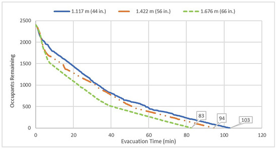 The analysis results from the study (see Figure 7) show that there is a reduction in the total evacuation time by 9% and 21% with an increase in the stairway width from 1.117 m (44 in.) to 1.422 m (56 in.) and 1.676 m (66 in.), respectively. However, it is clear from the results that the reduction in the evacuation time is not considerable compared to the effect of increasing the staircase width. This is mainly due to the space consumed by the assisting devices. The space consumed is such that no parallel flow of occupant traffic can move together to supplement the traffic flow. If we are to allow for two separate flows of occupant traffic, the required egress width becomes considerably large. Thus, increasing the egress width to reduce the evacuation time does not seem like a viable option. This result is in agreement with the findings by Kodur et al. [6] for an office building where similar results were obtained for office occupancy. Furthermore, solely depending upon the stairway width to decrease the total evacuation time could be a bad option as the blockage of that stairway due to fire would lead to dire consequences.