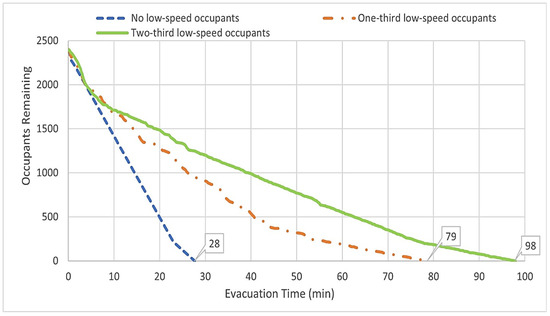 The results presented in Figure 8 show that the total evacuation time increases by almost 3 times to 79 min when one-third of the occupants move at a low speed, while it increases by 3.5 times to 98 min when the number of low-speed occupants increases to two-thirds of the total occupant population. It is observed that the slow-speed occupants obstruct the path of the normal-speed occupants who are not able to move past them due to a limited egress width and higher occupant density thus lowering the flowrate. The egress width becomes further limited due to the space occupied by the assistance device (wheelchair and bed). It is apparent that the presence of low-speed occupants adversely affects the occupant flow rate. Thus, optimum strategies such as phase-wise evacuation and a dedicated exit for low-speed occupants needs be incorporated to better modulate this low flow rate.