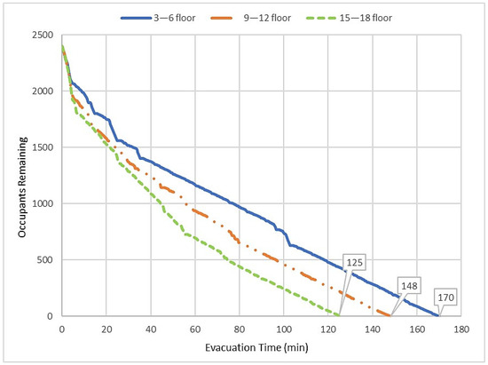 The evacuation times plotted in Figure 9 show that the evacuation time becomes critical when the fire is located at the lower end of the hospital building. The total evacuation time when the fire is on from the third to sixth floor is 170 min, which is 36% and 15% higher than a fire at the top level and the intermediate level. This result agrees with the conclusion drawn by Kodur et al. [6] for the office building with the same occupancy which considers the location of a fire at a bottom level to be the central case for designing any fire evacuation framework.