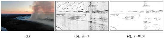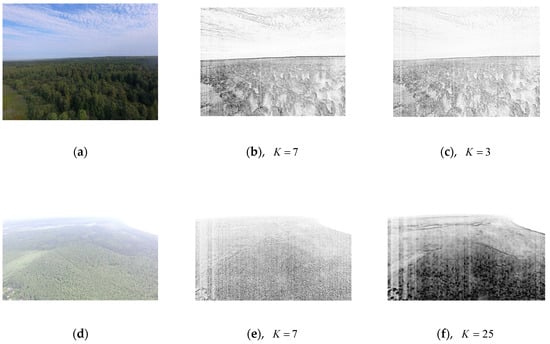 The size of the square sliding window K has a key effect on the results of solving a number of computer vision problems []. Therefore, the choice of optimal K significantly affects the quality of the problem solution. The results of processing some landscape images with different K are presented in Figure 1.