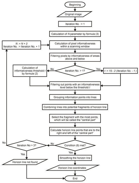 - Emelyanova, Y.G. Algorithm for finding the horizon line in images taken from an unmanned aerial vehicle camera. Aerosp. Instrum. Mak. 2023, 1, 40–53. (In Russian) [Google Scholar] [CrossRef]