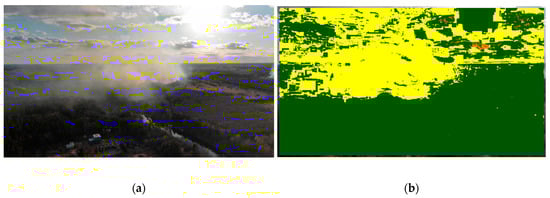 For full-color images, statistical components of captured pixels are extracted from each position of the scanning window, as well as values of the Lavas features. The result is an image with regions of interest highlighted using color markers: Each pixel of the resulting image is colored based on the classification result of the individual scanning window position. “Normal” corresponds to green, “fire” to red, “fire with smoke” to orange, and “smoke” to yellow. The program can be used for the prompt detection of forest fire foci using Earth remote sensing data.