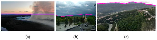 Next, let us consider several methods for detecting the horizon line in the frame. In the work [], the pixels located at the peak of the brightness gradient from light to dark in the vertical direction are recommended to be selected as a potential horizon line. In the study [], DenseNet neural networks and dynamic programming methods are successfully used. Another example of using machine learning principles is [], where automatic segmentation based on the DeepLabV3+ neural network and the conditional random fields method is applied. In the work [], linear filters and local analysis of structures in the image are used. The method of separating the water surface and the sky in images is presented in [], where the Gaussian filter is applied, and the areas potentially belonging to the horizon line are the areas containing the maximum value gradients of the integral image.