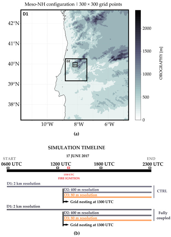 The simulations were performed using three two-way nested domains configured with 300 × 300 grid points and horizontal resolutions of 2 km (D1), 0.4 km (D2), and 0.08 km (D3), as shown in Figure 1a. The innermost domain, which is the one coupled with the ForeFire code, was configured with high horizontal resolution in order to study the atmospheric features of the fire environment. The vertical resolution is the same for all the domains, with 50 levels up to 20 km, stretching gradually from 30 m height (bottom and following the terrain) to 900 m (top). Figure 1b displays the timeline of each simulation. The simulation with the 2 km resolution (D1) began on 17 June 2017 at 0600 UTC, with the grid nesting (D2 and D3) beginning at 1300 UTC (Figure 1b). Initial and lateral boundary conditions for the outer domain were provided by a European Center for Medium-Range Weather Forecasts (ECMWF) analysis (updated every 6 h) considering the ECMWF’s Integrated Forecasting System (IFS) with a horizontal resolution of about 9 km.