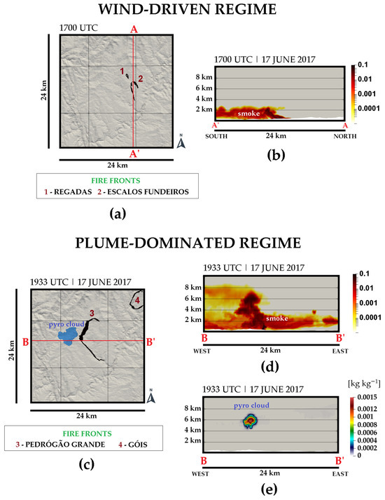 The fire regime on 17 June 2017: wind-driven regime (a) the fire fronts at 1700 UTC are illustrated through the smoke tracer concentration variable (S). The red line represents the cross-section (A–A’) location. (b) The vertical cross-section of the smoke tracer concentration variable (S) at 1700 UTC. The plume-dominated regime: (c) the fire fronts at 1933 UTC are illustrated through the smoke tracer concentration variable (S) and the figure shows the development of a pyro-cloud from the liquid water content, i.e., cloud droplets (blue areas). The red line represents the cross-section (B–B’) location; (d) as (b), but at 1933 UTC; (e) a pyro-cloud (kg kg−1) formed inside the the smoke plume displayed in Figure (d). The pyro-cloud is represented by the sum of the mixing ratios of cloud droplets and graupel.