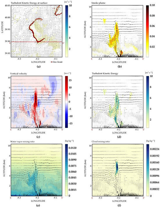 The main features of the plume-dominated regime on 17 June 2017 at 2000 UTC: (a) the turbulence kinetic energy (m2 s−2) and wind direction at the surface (m s−1). The fire front is represented by the dark red contour and the red line represents the E–E’ cross-section location. Vertical cross-section E–E’ showing: (b) the smoke tracer concentration variable (S) and wind vectors (arrows), (c) the vertical velocity (m s−1) and wind vectors (arrows); (d) the turbulent kinetic energy (m2 s−2) and wind vectors (arrows); (e) the water vapor mixing ratio (kg kg−1) and wind vectors (arrows); and (f) the cloud mixing ratio (kg kg−1) and wind vectors (arrows).