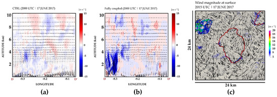 (a,b) show the D–D’ vertical cross-section indicated in Figure 3a with vertical velocity (m s−1) at 2000 UTC in the CTRL and fully coupled simulations, respectively; (c) the wind field at the surface (colored areas for wind magnitude and arrows for wind direction) and the burned area (red contour) on 17 June 2017 at 2015 UTC.