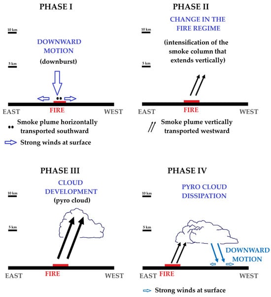 The main features explaining the fire regime which have been identified in this study are summarized in Figure 6. The first stage is characterized by the occurrence of a descending air motion which produced strong and turbulent winds at the surface and over the fire front (STAGE I), contributing to the convection. This led to the vertical development of the smoke plume (STAGE II), which favored the formation of pyro-clouds inside it (STAGE III). The final stage, when the pyro-cloud started to dissipate, is marked by an outflow that formed at middle levels from the pyro-cloud and produced strong winds at the surface as it touched the ground (STAGE IV). In the simulation, the four stages together took less than 1 h 30 min.