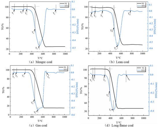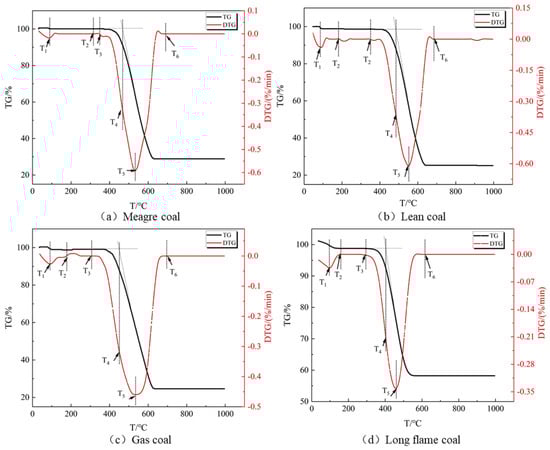 Low-temperature oxidation of the coal sample took place under the thermogravimetric analyzer’s temperature program. While the water in the coal samples gradually evaporated, they adsorbed O2 and released CO, CO2, and other gases. In the beginning, the water evaporation rate was far greater than the O2 adsorption rate. Therefore, the weight loss rate in the coal sample continued to increase. When the critical temperature T1 was reached, the rate of weight loss in the coal sample peaked. As such, T1 corresponds to the DTG curve’s initial peak position, which was also the first temperature point at which the velocity of the coal–oxygen composite reaction increased []. The oxygen adsorptive capacity of the coal samples increased with temperature, while the thermal weight loss rate of the samples slowly decreased. When the water evaporation rate and the oxygen adsorption rate of the coal sample reached a dynamic equilibrium, the rate of thermal weight loss was 0. At this time, the water had essentially evaporated from the coal samples, and the dry cracking temperature T2 was reached []. At this time, some active groups started to react with O2 to generate oxygen-containing intermediates, which were stored in the coal sample, and the quality started to increase. When the temperature reached the thermal decomposition temperature T3, the coal’s weight gain rate due to oxygen absorption and its own reaction consumption rate reached dynamic equilibrium []. The thermal weight loss rate of the coal samples again became 0 and their mass growth rate was maximized, indicating the end of the weight gain stage. After reaching the pyrolysis temperature T3, the coal sample was oxidized and decomposed, resulting in a significant reduction in quality. The internal energy of coal molecules increased as the temperature continued to increase, leading to the thermal decomposition of the circular structure inside the coal molecules. The quality of the coal samples continued to decrease and, after reaching the ignition temperature T4, the coal sample started to burn []. After exceeding T4, the coal sample presented a violent oxidation reaction, resulting in a significant quantity of gas being released and the primary coal molecular backbone structure being disrupted, which quickly reduced the coal sample’s quality. After reaching the temperature T5, the coal sample’s thermal weight loss rate reached its maximum value. The maximum pyrolysis rate at temperature T5 on the DTG curve corresponded to the lowest point. At this time, the heated oxidation chemical decomposition reaction was the most intense, generating CO, CO2, H2O, and other trace gases. The active ingredient in the coal was basically consumed, and the combustion rate gradually decreased after this point. Until reaching the burnout temperature T6, the quality of the coal samples tended to stabilize and no longer changed []. The TG-DTG curve inclined to a stable value at T6, indicating that coal’s oxidation and decomposition process had basically concluded.