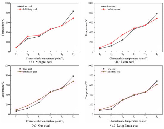 Figure 4 shows the characteristic temperature changes in various coal samples before and after inhibition during the thermogravimetric experiment. After the coal samples were treated with hydrated phase change materials, their critical temperatures (T1) increased. Lower coal spontaneous combustion grade and lower coal body spontaneous combustion capacity were associated with higher critical temperatures. At low temperatures, hydrated phase change materials exhibited the most effective inhibitory effect on the spontaneous combustion of coal at temperatures ranging from 60 °C to 90 °C. This is because, at temperatures ranging from 60 °C to 90 °C, the hydrated phase change materials underwent a phase change when heated to the critical temperature point, thus maximizing heat absorption and reducing the rate at which coal’s temperature increased, while also isolating oxygen from the coal, resulting in the prevention of spontaneous combustion. The inhibited lean and meagre coal samples had higher thermal decomposition temperatures T3 and dry cracking temperatures T2 than the raw coal. In the inhibited gas coal samples, the temperature T5 of the maximum thermal weight loss rate, the burnout temperature T6, and T2 were all higher than those observed for the raw coal. The values of T2, the ignition temperature T4, and T5 for the inhibited long-flame coal sample were higher than those of the raw coal, indicating that the hydrated phase change material mainly acted on the stages of water loss, weight loss, oxygen absorption, and weight gain in meagre and lean coal. It also acted on the stages of water loss, weight loss, and combustion of gas coal and the stage of water loss, weight loss, and pyrolysis in long-flame coal.