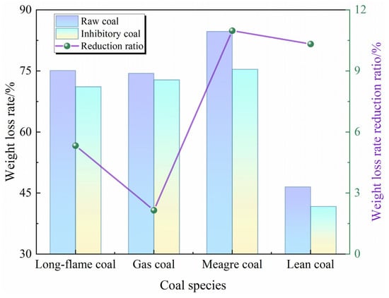 Figure 5 shows the weight loss rate and its reduction ratio observed in the thermogravimetric experiment before and after the inhibition of various coal samples. The calculation formula for the weight loss rate decrease ratio is shown in Equation (1):
