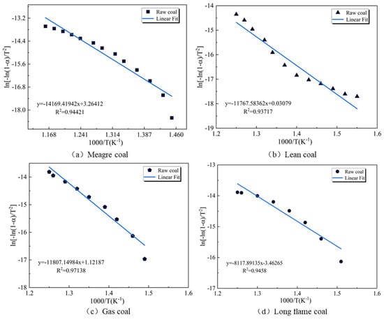 Based on the above research, using the thermogravimetric analysis method, we can study and analyze a coal body’s chemical process under changes in the temperature conditions or isothermal oxidation kinetics of solid materials. To determine the reaction’s activation energy, the Coats–Redfern integration method was used to process the thermogravimetric curve [], and its oxidation reaction kinetics equation is expressed as follows: