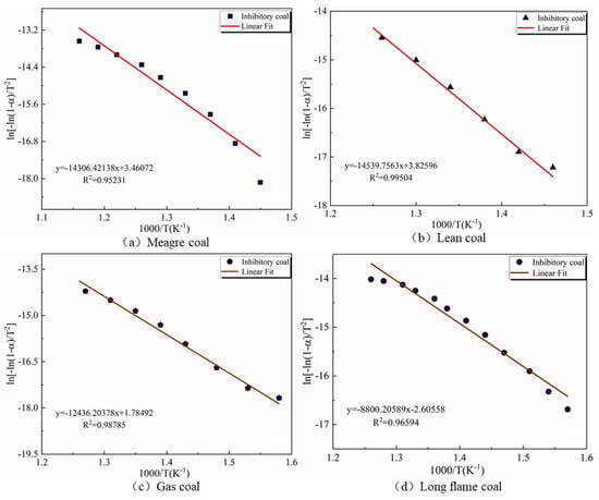 When and are plotted as a function graph, the slope on the graph is . The activating energy can be obtained through calculation. The intercept on the graph is , which can be calculated according to the pre-exponential factor. Figure 6 and Figure 7 show the correlation analysis results for the oxidation reactions before and after inhibition in coal samples with four varying intensities of metamorphism.