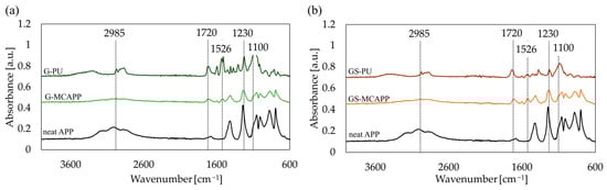 The presence of the PU shell was first confirmed with Fourier-transform infrared analysis (FTIR). The most prominent peaks on the spectra of G-MCAPP and GS-MCAPP microcapsules were the characteristic absorption peaks of neat APP as expected since APP comprises about 80% of the microcapsules. Meanwhile, the polyurethane-specific bands for the G-PU and GS-PU components were also detectable as indisputable evidence of the successful microencapsulation.