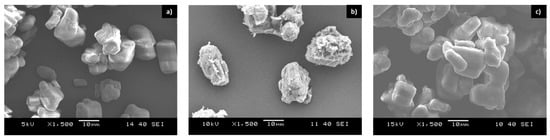 Under the scanning electron microscope (SEM), both G-MCAPP and GS-MCAPP show the presence of the shell layer compared to the neat APP, as seen in Figure 2. G-MCAPP microcapsules have rough textures, and tears of the shell are visible, even though this proves that the microencapsulation by G-PU was successfully achieved. Microencapsulation with GS-PU seems to be more advantageous since the GS-MCAPPs have smoother and rounder surfaces, do not reveal any cracks or holes, and cover all the sharp edges of APP.
