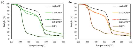 Decomposition curves of neat APP, its theoretical composition with (a) G-PU for G-MCAPP and (b) GS-PU for GS-MCAPP, respectively, in N2 atmosphere.