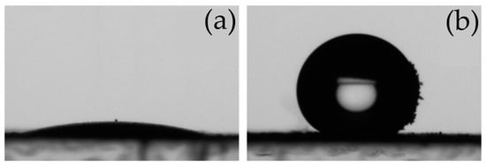 The wetting properties of the neat APP and microencapsulated GS-MCAPP particles were investigated by optical microscopy and contact angle measurements. According to micrographs, the APP particles were dispersed in the water phase and uniformly located in the entire droplet. However, the GS-MCAPP particles formed aggregates and primarily grouped at the water–air interface, which suggests the hydrophobic character of the PU shell. The images of 10 μL water droplets on the surface of the dried layers of the APP and GS-MCAPP particles are shown in Figure 4.