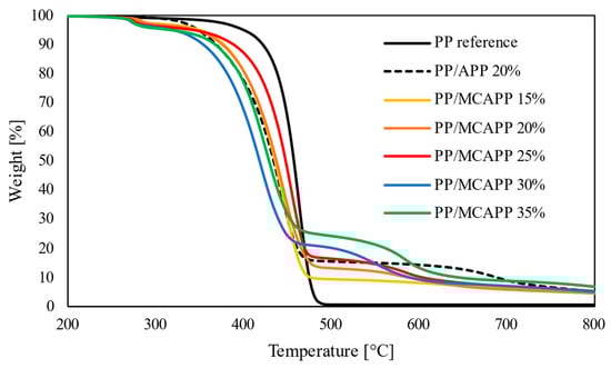 The decomposition curves of the reference sample and the flame-retarded composites are shown in Figure 6. The thermal decomposition of neat PP started at a temperature around 350 °C, higher than the flame-retarded composites, but it degraded completely in one step by 500 °C, leaving no mass residue. The addition of flame retardants shifted the decomposition temperatures to the lower temperature range; however, it significantly slowed down the decomposition rate as well. The composite samples degraded in several steps and yielded higher residual masses which are not attributable to the mass of added flame retardants in the composites, but rather to the beneficial interaction of the PU shell on the APP core in the microcapsules.