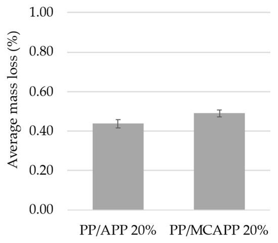 Samples with a 20% additive content of neat APP and MCAPP in PP were water bath-treated and compared in the water resistance test. In the literature, microencapsulation was reported to improve the water resistance of the flame retardants (for example, by forming a hydrophobic barrier layer; see the end of Section 3.2); however, in our case, we observed a somewhat greater average mass loss in the PP/MCAPP 20% sample than in the PP/APP 20% sample (Figure 7). The treated specimens were then tested in the LOI, where we observed no change in the LOI values compared to the untreated specimens. The microcapsules with greater average mass loss were expected to decrease, but the fact that it remained unaffected showed that the composites with microcapsules were effective in retaining their flame retardancy after immersed in a water bath for 3 days.