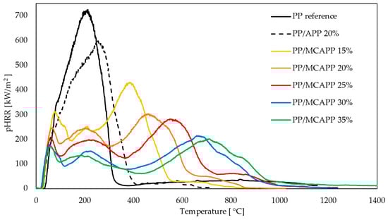 The curves of neat PP and PP/APP 20% run steeply upwards as the thermal degradation of the materials released extensive heat due to the lack of the protective char layer, and the abrupt downward trend indicates the depletion of combustible material as the samples completely burned, leaving almost no residual mass in the case of the reference sample. The reason for the sharp rising and falling of the heat release curves is that the neat PP and PP/APP 20% composites did not contain any carbonizing agent that could help them create a protective charring layer to insulate the polymer from the fire. The samples containing MCAPP showed typical intumescent-type curves [24] with an elongated heat release and peak value at the end of the burning.