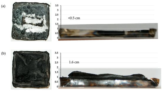 When observing the char residues left after the combustion, noting that the neat PP burned completely without leaving any residue, the composite containing neat APP left a discontinuous layer of residue with small, seemingly charred bubbles with no significant height. When it was prepared for testing under the SEM, the consistency of the bubbles was sticky and gave the impression of pyrolytic products’ residue (Figure 10a). The composites with microcapsules, on the contrary, had continuous, foamed, and charred residue, with heights varying from 1.5 cm to 2.0 cm as the content of the additive increased; for comparison, the photographs of PP/MCAPP 20% are shown in Figure 10b. These charred foams, however, lacked the compact, solid bulk structure as they showed a hollow internal cavity when cut across. For the SEM, the samples were prepared from the densest layer.