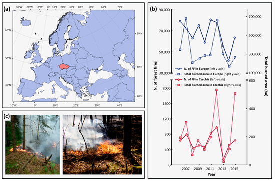 (a) Position of the Czech Republic in Europe; (b) a comparison of trends in the number of forest fires and burned areas in Europe and the Czech Republic in the study period 2006 to 2015; and (c) typical forest fires occurring in the Czech Republic. Source of the forest fire data for Europe: [3]; source of the forest fire data for Czechia: General Directorate of Fires Rescue Service of the Czech Republic; photographer credit: Jan Vaněk, 2018.