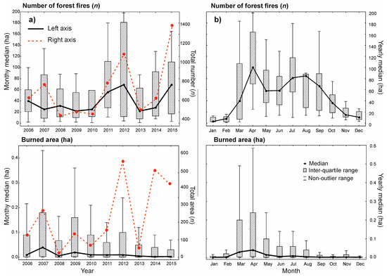 (a) Inter-annual and (b) monthly pattern of forest fire numbers and burned areas during our study to assess drivers of forest fire occurrence in the Czech Republic during 2006 to 2015. Medians (boxplots, left axis) and totals (red dotted line, right axis) are shown for the yearly values. Outliers beyond 1.5 of the inter-quartile range were removed for clarity.