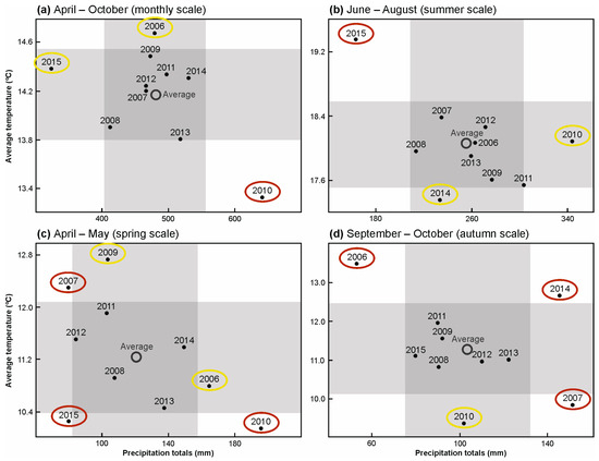The position of years of the studied period in temperature–precipitation spaces characterizing different parts of the year: (a) April to October, (b) June to August, (c) April to May, and (d) September to October. Black circles indicate the average position of the 2006 to 2015 period. Dark gray rectangles represent the standard deviation of the two variables. Ellipses indicate years outside standard deviation ranges for one (yellow) and both (red) climatic variables.