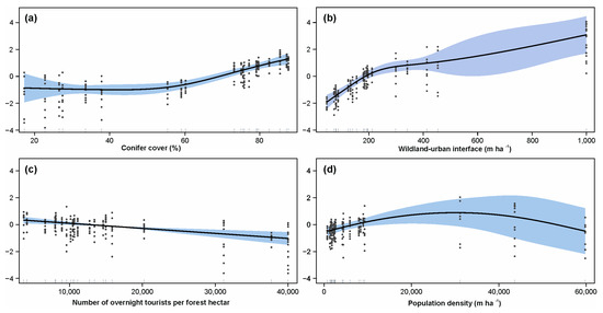 Responses of the number of forest fires per forest area (n ha−1) that occurred in the Czech Republic during 2006 to 2015 to predictor variables with statistically significant effects. Results of analysis conducted on an annual scale are presented. Smoother functions fitted by Generalized Additive Models (line), 95% confidence interval (blue shaded area), and residuals (points) centered at a zero mean value are indicated. Forest fire responses to the (a) percentage of conifers, (b) length of the wildland–urban interface, (c) number of overnights, and (d) number of residents are displayed.