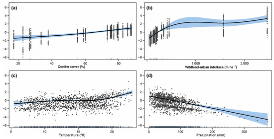 Responses of the number of forest fires per forest area (n ha−1) that occurred in the Czech Republic during 2006 to 2015 to predictor variables with statistically significant effects. Results of analysis conducted on a monthly scale are presented. Smoother functions fitted by Generalized Additive Models (line), 95% confidence interval (blue shaded area), and residuals (points) centered at a zero mean value are indicated. Forest fire responses to the (a) percentage of conifers, (b) length of the wildland–urban interface, (c) air temperature, and (d) precipitation are displayed.