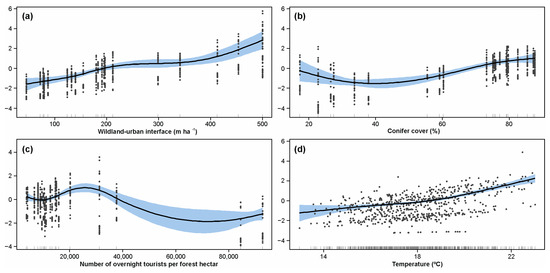 Responses of the number of forest fires per forest area (n ha−1) that occurred in the Czech Republic during 2006 to 2015 to predictor variables with statistically significant effects. Results of analysis conducted on a summer scale are presented. Smoother functions fitted by Generalized Additive Models (line), 95% confidence interval (blue shaded area), and residuals (points) centered at a zero mean value are indicated. Forest fire responses to the (a) percentage of conifers, (b) length of the wildland–urban interface, (c) number of overnights, and (d) air temperature are displayed.