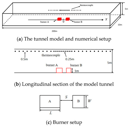 A numerical model (with size of 200 m × 10 m × 5 m) was created. Two rectangular fire sources, denoted as burner A and B, were used, with heptane as fuel. Based on the fire source size used in previous tunnel fire research [35], burner A’s width and height were set as 1 m, with length setting as 1 m, 1.2 m, 1.5 m, 1.8 m, and 2 m. Burner B’s dimensions were fixed at 1 m in all three dimensions. The fire sources were located along the tunnel’s longitudinal midline, while the distance between the edges of the two fire sources were adjusted to change the fire spacing from 0 m to 2 m. To detect the longitudinal temperature distribution beneath ceiling, a number of thermocouples were inserted. The longitudinal spacing between thermocouples located in the vicinity of fire sources is 0.25 m, while the spacing between thermocouples positioned further away from fires on both sides is 0.5 m. Concrete was chosen as the material for the tunnel’s walls and ceiling in FDS. The environment has an initial ambient temperature of 20 °C and an atmospheric pressure of 101,325 Pa. To simulate natural ventilation, two ends of the tunnel were configured as open boundaries. Through multiple simulation tests, the duration of the simulation was set to 200 s. A constant heat release rate was chosen for this simulation, and the fire burns for 10 s to reach its maximum heat release rate and then maintains this value for the subsequent simulation time. Figure 1 shows the specific settings of the tunnel numerical model; the relevant specific simulated cases can be seen in Table 1.