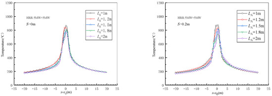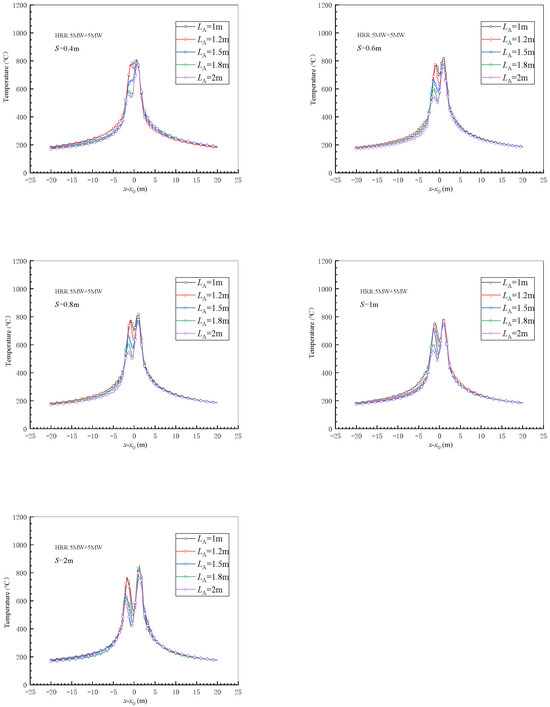 Taking the case of a fire source power of 5 MW as an example, Figure 4 shows the longitudinal TD beneath the tunnel ceiling under natural ventilation. The x-coordinate 0 represents the central position between the two burners in the longitudinal direction, and the x-x0 indicates the reference point to points x0. The figure shows that the smoke temperature below ceiling decreases as the size of fire source A increases. It is also observed that the side with the increased fire source size shows a more significant decrease in temperature peak. This decrease mainly occurs near the fire sources, with less noticeable temperature changes in areas far from the dual fire sources. Figure 4 illustrates that when the two fire sources distance is small, there is only one peak. However, when both the area of fire A and the fire distance increase, two peaks appear. The two fire sources’ interaction decreases with increasing distance between them. In the case of constant power of the fire source, as the area of the fire source increases, the height of the flame decreases. In addition, the air entrainment of the fire plume is enhanced, resulting in a decrease in the temperature of the ceiling. Figure 5 shows the positions where fire plumes hit the tunnel ceiling and the locations of the highest temperatures.